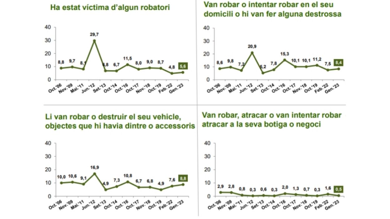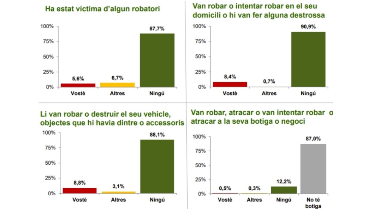 La nota que posen els enquestats sobre la seva sensació de seguretat contrasta amb les persones que admeten haver estat víctimes directes de robatoris a la ciutat. Segons les respostes dels enquestats de l’Observatori Sociològic, més d’un 87% no ha patit cap robatori al carrer, dins de casa o de l’interior del seu vehicle aparcat, ni tampoc n’ha patit ningú que convisqui amb ell.