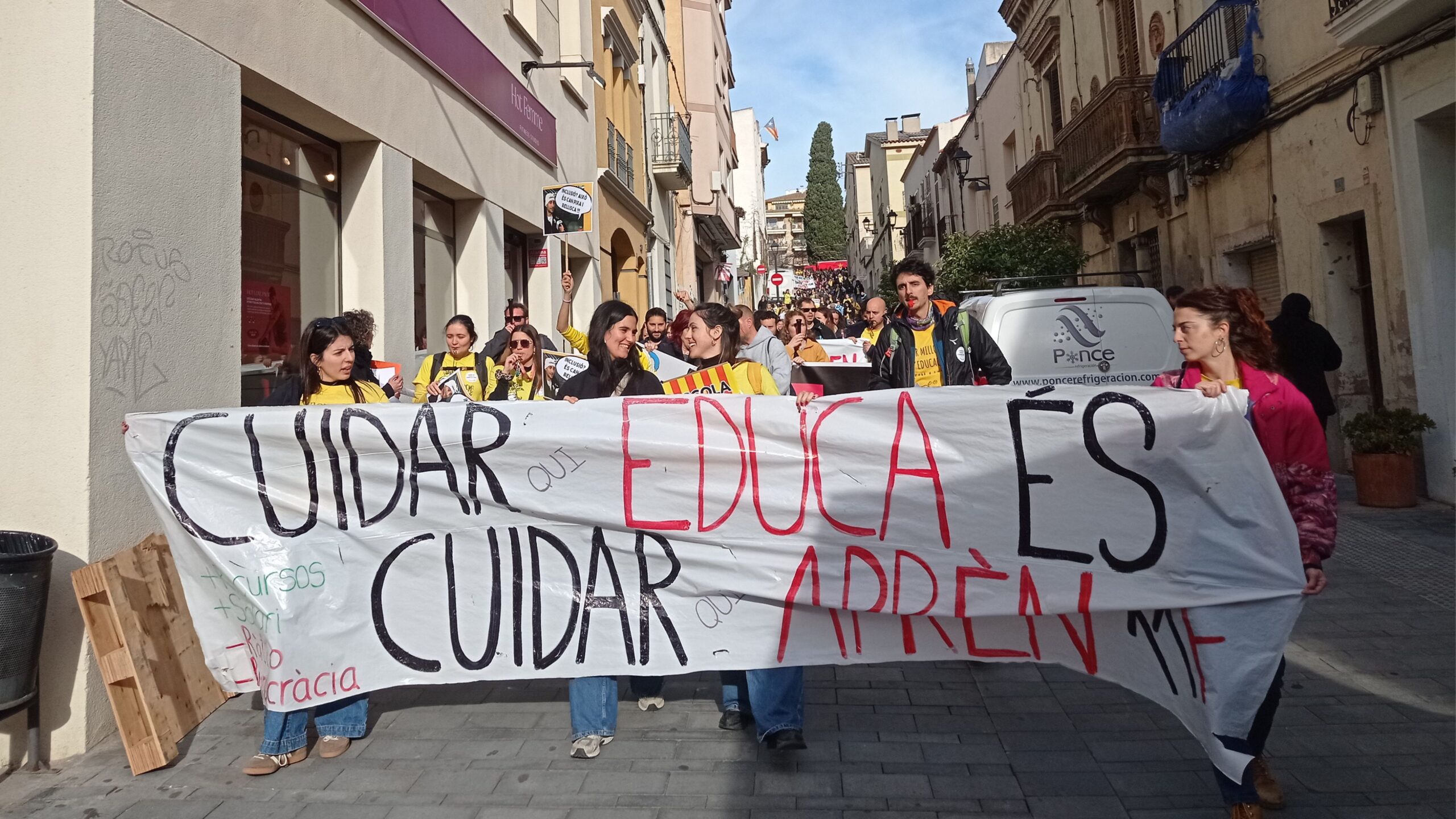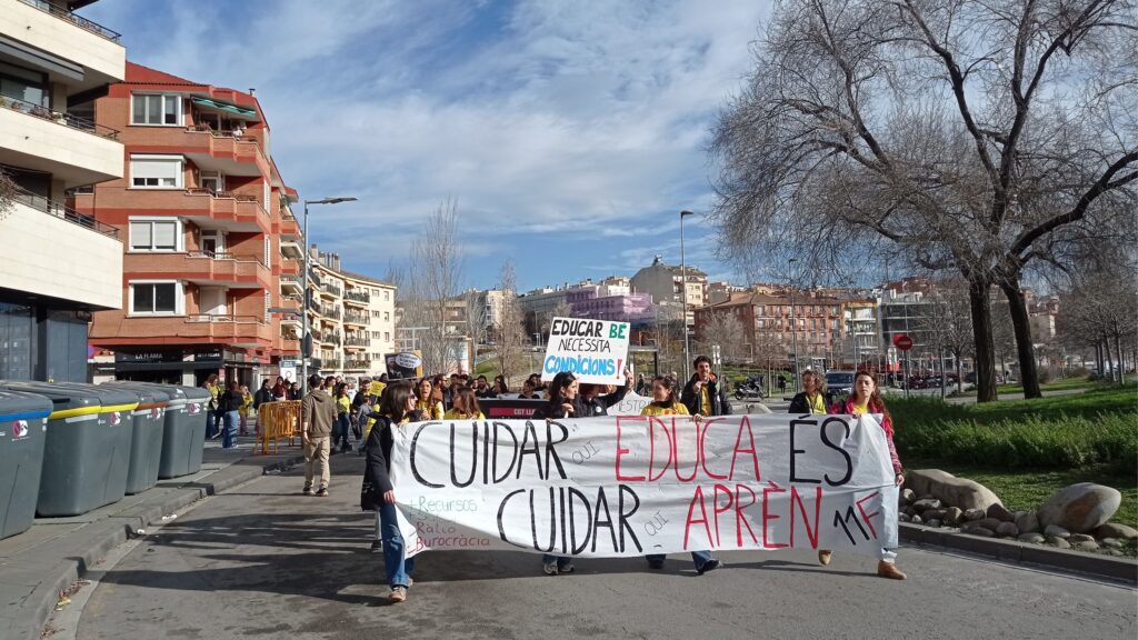 Prop de 250 persones s’han manifestat a Sant Cugat aquest dimecres amb motiu de la vaga del sector educatiu convocada a tot Catalunya per reclamar unes millors condicions laborals i millores salarials. “Les condicions actuals fan difícil garantir una educació de qualitat per a tots els infants i joves”, clama el manisfest, així com “cuidar qui educa és una condició imprescindible per cuidar qui aprèn”.