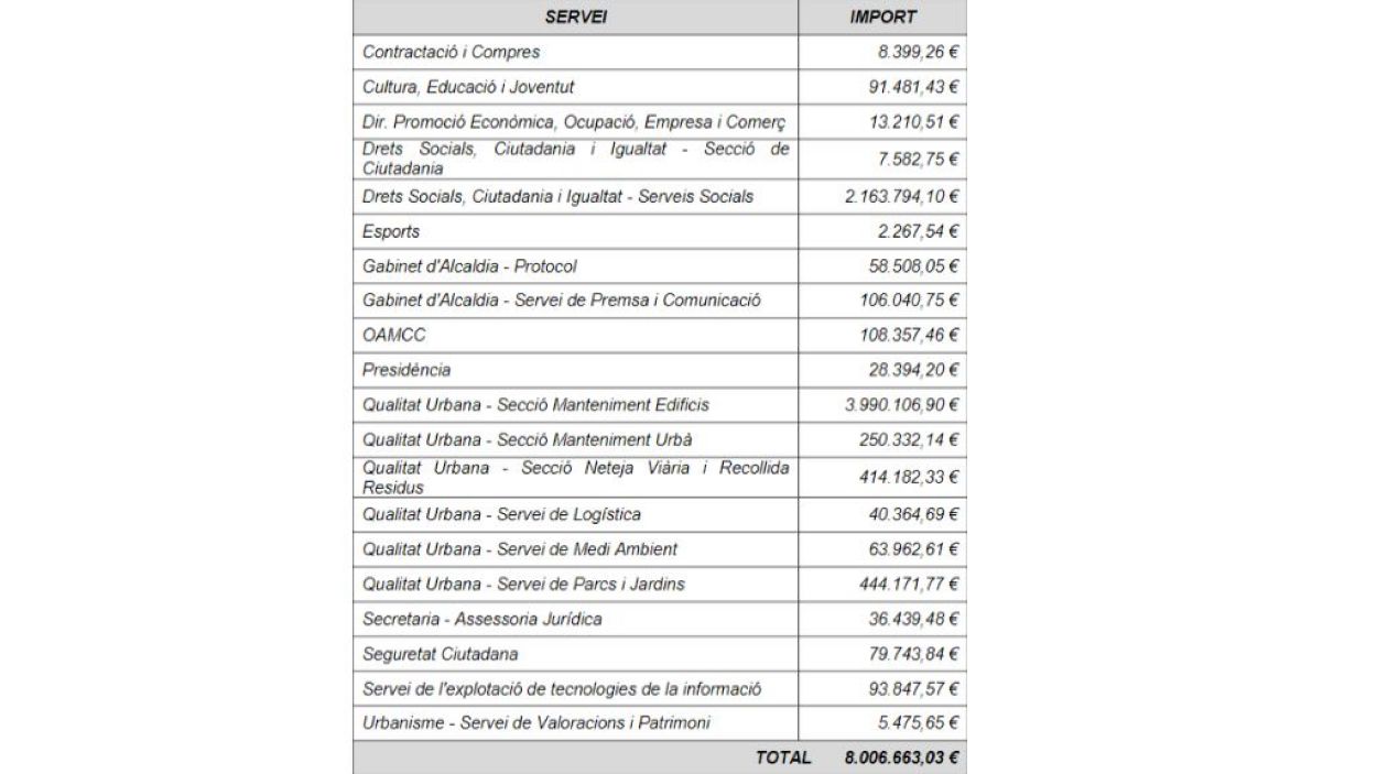 La quantitat que s’ha aprovat a cada ple s’ha anat reduint en funció que s’han anat adjudicant les prestacions dels serveis o els contractes caducats. Per exemple, al ple d’aquest dilluns s’ha aprovat un reconeixement de crèdit per valor de 180.534 euros, lluny del milió que s’aprovava mesos enrere.