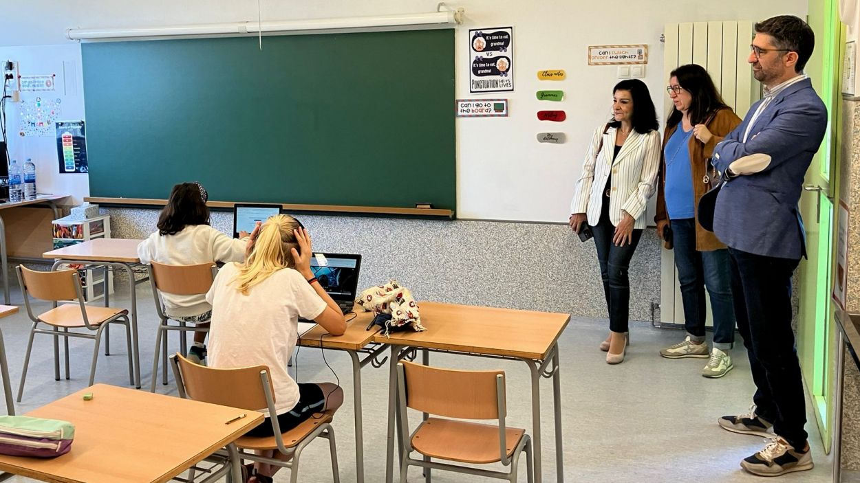 La presidenta del comitè de l’agermanament amb la ciutat d’Alba, Gemma Navarra, la regidora d’Educació, Carme Ardid, i el tinent d’alcaldia Jordi Puigneró, presenciant l’intercanvi lingüístic / Cugat Mèdia