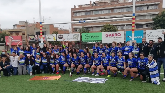 L’equip femení del Club Rugby Sant Cugat puja a Divisió d’Honor, màxima categoria estatal, en derrotar (38-7) al BUC a la final disputada aquest diumenge a l’estadi Baldiriu Aleu de Sant Boi. Les santcugatenques ascendeixen per primera vegada a l’elit del rugbi espanyol. La final ha estat dominada des del principi per les d’Albert Casorrán que han marxat al descans amb un (19-7) favorable a les blau-i-negres. A la represa, les santcugatenques han exhibit potencial ofensiu i múscul defensiu amb una segona part brillant. L’acaldessa, Mireia Ingla, ha entregat la copa de campiones a l’equip santcugatenc.